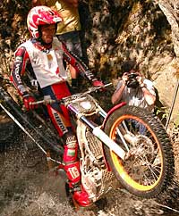 毎年同じ町で開催されているアンドラ大会だが、セクションを設営するエリアには数ヶ所があって、毎年その中からいくつかをチョイスして15セクションを用意している。今回は第1から第7までが沢の中のセクションだった。この沢の中の岩が、つるつるとよく滑った。そして今回は、第1セクションからがいきなり難所だった。水の中から斜めに飛び上がって大岩に飛びつくもので、うまくいければ減点1で走破可能、失敗すれば5点だ。ここを藤波はうまく走破して1点。1ラップ目に1点でここを抜けたのは藤波とランプキンの二人だけだった。幸先のいいスタートである。
